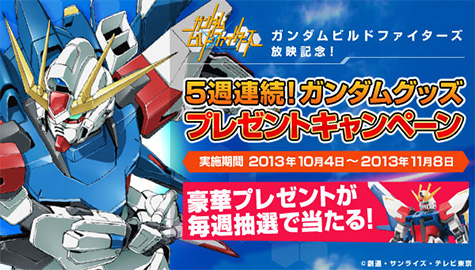 バンダイ公式ショッピングサイト「プレミアムバンダイ」で実施中の「ガンダムビルドファイターズ放映記念!ガンダムグッズ5週連続!プレゼントキャンペーン」では、本日11月1日(金)より第5週の応募受付がスタートした。