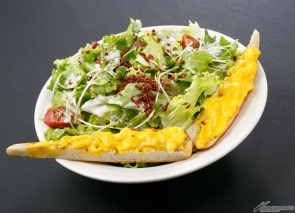 ペペロンチーノベースの大盛りサラダパスタ。とろっと玉子をかけたガーリックパンとの相性が抜群!