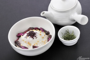 鮮やかな赤紫色のしば漬けとゆかりの風味がきいた鶏出汁茶漬け。温泉卵添え。