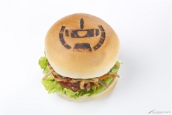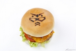 Four kinds of hamburger, with Gundam or Char's Zaku designs toasted into the bun!