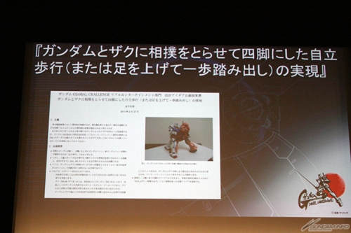 発表会は、18mのガンダムを実際に動かす「リアルエンターテインメント部門」と、視覚効果を利用して仮想空間で動きを再現する「バーチャルエンターテインメント部門」の2部門で、昨年7月から今年2月にかけてアイディアを一般公募した第一次募集の結果を発表するもの。