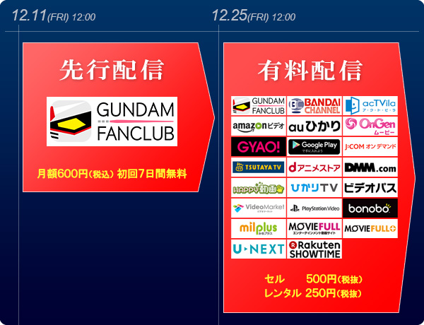 先行配信期間は12月25日(金)で終了し、以降は国内23サービスでの有料配信がスタート。有料配信では、従来の 「レンタル版」に加えて、視聴期限のない 「セル版」が、ガンダムシリーズで初めて実施されます。