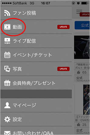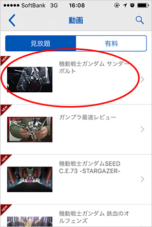 ▲左上のメニューから「動画」を選択、「機動戦士ガンダム サンダーボルト」をタップしよう!