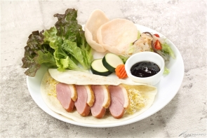 ~ปลาอินทรีย่างสไตล์ซีจิง, เป็ดย่าง, ไข่ม้วน, กะหล่ำดองและซุปไก่~
