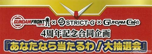 "Gundam Front Tokyo", "STRICT-G", "Gundam Café" ซึ่งตั้งอยู่ภายในห้าง "DiverCity Tokyo Plaza" โอไดบะ โตเกียว ฉลองเปิดทำการครบ 4 ปีโดยร่วมกันจัดโปรเจ็ค "มหกรรมชิงโชค ถ้าเป็นคุณต้องถูกรางวัลแน่!" ตั้งแต่วันจันทร์ที่ 11 เม.ย. นี้เป็นต้นไป