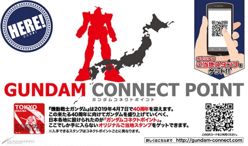 Gundam Connect Point ได้รับการออกแบบเพื่อเตรียมรับกับ “ช่วงครบรอบ 40 ปี Gundam” ที่จะมีการอัพเดตภาพที่จัดแสดงตามอีเว้นต์และสถานที่ โดยสามารถเชื่อมต่อกับ Connect Point ด้วยสมาร์ทโฟนภายระยะ 300 เมตร รอบ Connect Point ผ่านทางเว็ปเพจพิเศษ และสามารถรับแสตมป์ฟรี
