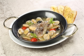 【ซ้าย】<อากิฮาบาระ โอซาก้า>รสชาติของดาวโลกนั้นคือพรจากทะเลอันไพศาล~อควาพัซซ่า ปลาไวท์ฟิช กับ หอยอาซาริ นึ่งไวน์ขาว~