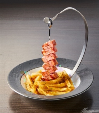 เบคอนชิ้นหนาเสียบไม้แขวนให้ดูเหมือนหอบัญชาการ เสิร์ฟพร้อมมันฝรั่งทอดและผักชี