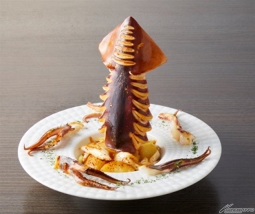ปลาหมึกย่างถูกนำมาตั้งให้เหมือนสว่าน ราวกับเจาะทะลุพื้นผิวแห่งมันฝรั่งขึ้นมา