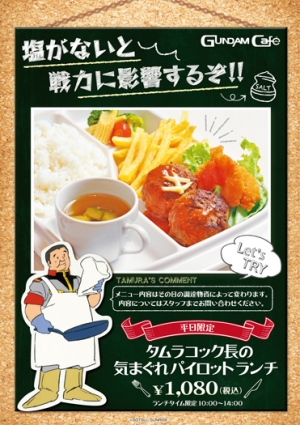 ณ ร้านคาเฟ่กันดั้มอย่างเป็นทางการ [Gundam Café สาขา Akihabara] เมนูที่นำเอาอิมเมจจากอาหารที่หัวหน้าเชฟ Tamura ผู้โบกไม้โบกมืออยู่ภายในยาน White Base จากอนิเมในตำนาน [Mobile Suit Gundam] [Whimsical Pilot Lunch ของ หัวหน้าเชฟ Tamura] เมนูสุดเอ็กซ์คลูซีฟนี้จะถูกเสิร์ฟในช่วงวันธรรมดาคือ อังคารที่ 16 มกราม ในราคา 1,080เยน (รวมภาษี)