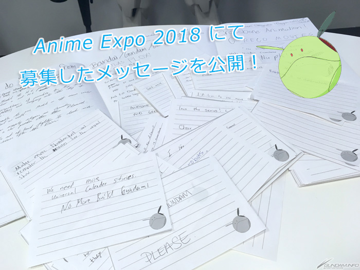 งาน Anime Expo 2018(AX2018)จัดขึ้นเมื่อเดือนกรกฏาคมที่ผ่านมา เป็นงานเกี่ยวกับอนิเมและมังงะภูมิภาคอเมริกาเหนือ ทีมบก. Gundam.info ได้ไปติดตั้งกล่องรับความคิดเห็นที่บูธของกันดั้มเพื่อฟังเสียงตอบรับจากแฟนๆ ที่อยู่อีกฟากโลกหนึ่ง มาดูกันดีกว่าว่าพวกเขาเขียนอะไรกันบ้าง!