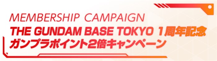 มีแคมเปญ “Double Gunpla Points” จัดขึ้นเป็นเวลา 2 วัน คือเสาร์ที่ 19 และอาทิตย์ที่ 19 สิงหาคม ซึ่งจะมอบคะแนนสะสมสำหรับสมาชิกให้กับคุณอีกหนึ่งเท่า เมื่อใช้จ่ายที่ GUNDAM BASE TOKYO