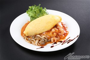 ・ข้าวห่อไข่วางบน กุ้งกับเห็ด ราดด้วยซอส WAmerican