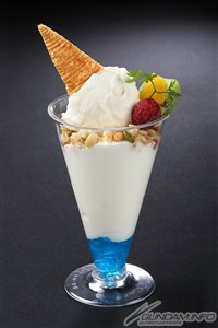 ・ไอศกรีมวนิลาซอลตี้พาเฟต์ใส่ข้าวโพดคั่ว และ ไอศกรีมรามูเนะ (เลมอนเนด) บนจานแบน