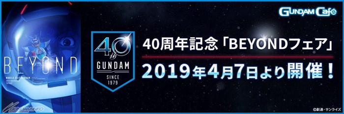 Gundam Cafe ทุกสาขา รวมถึง Gundam Square ใน Osaka กำลังจะมีงานแฟร์ในชื่อ "Mobile Suit Gundam 40th Anniversary Commemorative BEYOND Fair Part 1 ~The Possibility of That Called Hope~" หรืองาน BEYOND Fair ช่วงที่ 1 ~ความเป็นไปได้ของสิ่งที่เรียกว่า ความหวัง~ ที่ระลึกเนื่องในโอกาส ฉลองครบรอบ 40 ปี Mobile Suit Gundam จัดขึ้นในวันอาทิตย์ที่ 7 เมษายน 2019