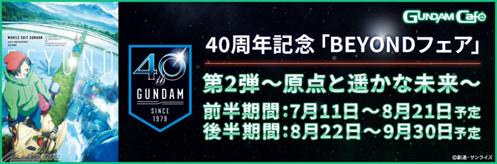 ที่ "Gundam Cafe" ทุกสาขา และ "Gundam Square" ใน Osaka, แคมเปญ "Mobile Suit Gundam 40th Commemorative BEYOND Fair Vol. 2 ~Origin and Distant Future~" เริ่มพฤหัสบดีที่ 11 กรกฏาคม 2019