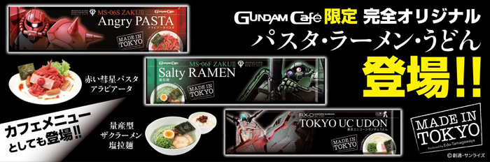 เมนูพิเศษทั้งสามจาก "อาหารเส้นที่ระลึก" ซึ่งเป็นการร่วมมือการระหว่าง ร้านคาเฟ่ต์เกี่ยวกับกันดั้มอย่างเป็นทางการ "Gundam Cafe" กับ ผู้ผลิตเส้นอบแห้ง "Tamagawa Food Co., Ltd." และ ร้าน "Edo-Tamagawaya" พร้อมวางจำหน่าย 8 สิงหาคมนี้ Arabica pasta "MS-06S ZAKU II Angry PASTA" ที่มาในอิมเมจของ Char's Zaku, ราเมงซุปเกลือ อิมเมจ Zaku ในชื่อ "MS-06F ZAKU II RAMEN" และเมนูอูด้งทั้งสามแบบใช้อิมเมจของประติมากรรม Unicorn Gundam ขนาด Life-Sized ในชื่อ [RX-O UNICORN GUNDAM Ver. TWC TOKYO UC UDON] ด้วยราคาเพียงห่อละ 400 เยน
