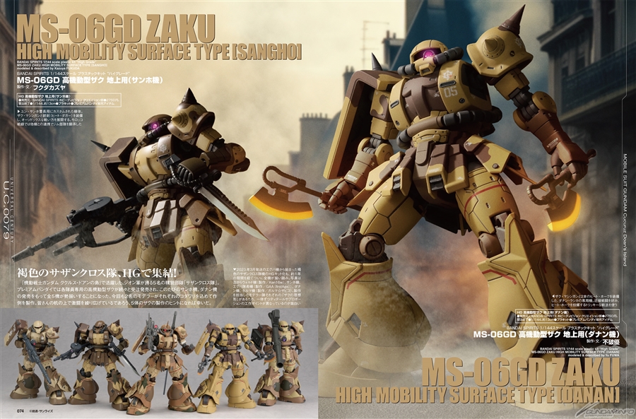 จาก Mobile Suit Gundam Cucuruz Doan's Island นำเสนอตัวอย่างการสร้าง HG 1/144 MS-06GD Zaku High Mobility Surface Type Sangho และ Danan kits! สร้างสรรค์โดยนักสร้างโมเดลมืออาชีพ Kazuya Fukuda และ Yu Fuwa โดยนักสร้างโมเดลแต่ละคนนำเสนอวิสัยทัศน์ที่เป็นเอกลักษณ์ของตนเองเกี่ยวกับ Zaku ในอุดมคติ บทความนี้จะนำเสนอจุดสำคัญของรายละเอียดที่แตกต่างกันและการปรับเปลี่ยนสัดส่วนสำหรับแต่ละยูนิต
