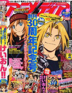 This is the 30th Anniversary issue! Bonuses include a huge 'K-On!!' treasure sheet! Also includes a special 30th Anniversary booklet featuring the history of anime and Animedia!
