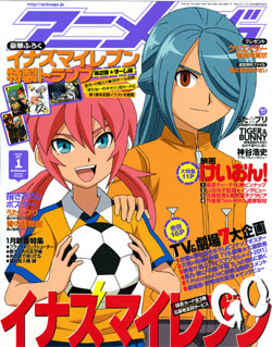 The cover story is Inazuma Eleven Go! This month's cover features Ichirota Kazemaru and Ranmaru Kirino♥ With a Fubuki and Yukimura pinup, we've got you covered for old/new teamups! There's 16 pages on Inazuma Eleven Go, and an interview with director Yoshikazu Miyao! Learn all about the movie! Plus, we talk with the cast, and ask Yuka Terasaki (Tenma), Takashi Ohara (Kenshiro), and Mitsuki Saiga (Shindo) how working on a movie differs from TV! We even bring you readers' picks for Inazuma Soulmates 2011! And there's a second set of Inazuma Eleven playing cards, this time focusing on teams! 54 cards illustrate 30 teams! The deck's rounded out by illustrations we couldn't fit in the first set, and the first card based on the ending theme 'Mata ne no Kiseki' makes this a must-have set for fans♥ Plus, survey responders get Inazuma/Inazuma Go book cards! We haven't forgotten about K-On! either! 11 pages cover the blockbuster new movie! We have a long interview with director Naoko Yamada, and talk about the story and high points with Satomi Sato (Ritsu) and Minako Kotobuki (Tsumugi)! There's photos, too☆ We even got to opening/theme composer Tom-H@ck♪ And there's a 'London Tea Time' pinup by Yukiko Horiguchi! That's not all! There's more than just Inazuma Go and K-On! pinups! We've got Uta no☆Prince-sama♪Maji Love 1000%'s 'S-Class in Snow' and Blue Exorcist's 'Rin and Yukio in Suits'♥ And we continue last issue's look at January's premieres! Look forward to next season's 'New Prince of Tennis', 'Ano Matsu de Matteru', 'Black★Rock Shooter', and 'Natsume Yujincho S4'! Rush out to your bookstore and puck up the January issue of Animage, with another year of New Year's cards direct from famous creators to readers!