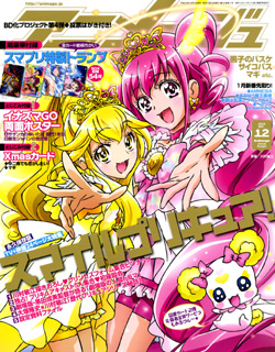 Smile Precure's "Ehon no Naka wa Minna Chiguhagu" flies off the silver screen and onto our pages!♥ The ninth annual Precure series adorns our cover this month. And this issue, we have our first talk with an entire 5-member Precure team! We also have an interview with movie director Narumi Kuroda, a conversation with TV director Takashi Ootsuka and character designer Toshie Kawamura covering the history of Precure, and more of the deep coverage that only Animage brings you! Our new "Setting Document File" series covers Smile Precure, and this issue comes with a deck of Smile Precure cards and a Princess Form pinup by Kawamura, so Smile Precure fans won't want to miss it! Even the monthly survey rewards everyone who responds with one of two special Smile Precure book cards. The cards feature Kawamura's art of the team before and after transformation! Plus, this month's issue also includes an Inazuma Eleven Go reversible poster.
