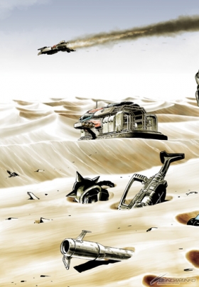 「サンダーボルト」本編は宇宙空間での戦争が描かれているが、外伝「砂鼠ショーン」では舞台を移し、一年戦争後の地上戦が繰り広げられる。