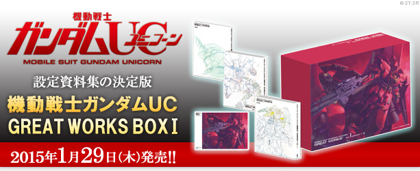 『機動戦士ガンダムUC』の膨大な資料を詰め込んだ設定資料集の決定版「機動戦士ガンダムUC GREAT WORKS BOX I episode 1-3」は、バンダイビジュアル公式ショップ「BANDAI VISUAL CLUB」ほか全国の書店にて好評発売中。