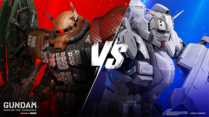 ผู้เล่นจะได้สัมผัสกับเกมการแข่งขันแบบทีมที่มีธีม Requiem for Vengeance ในโลกของ Fortnite พวกเขาจะถูกแบ่งออกเป็นทหารฝ่าย Zeon และฝ่าย Federation และแข่งขันกันฆ่าศัตรูในขณะที่สะสมคะแนน ซึ่งสามารถใช้คะแนนเพื่อเปิดใช้งาน Mobile Suit ได้ นอกจากนี้ ยังมี Zaku II (Unidentified Type) Solari และ Gundam EX ที่จะปรากฏตัวอีกด้วย และผู้เล่นสามารถใช้ความสามารถของพวกเขาได้ในขณะที่สนุกไปกับโลกของซีรีส์ใหม่