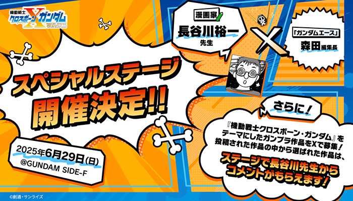 นอกจากนี้ จะมีกิจกรรมบนเวทีพิเศษที่ GUNDAM SIDE-F ซึ่ง Hasegawa จะปรากฏตัว และงานแจกลายเซ็นที่ร้านหนังสือ Kumazawa Bookstore LaLaport Fukuoka เพื่อฉลองการวางจำหน่าย Mobile Suit Crossbone Gundam Seeräuber เล่มแรก อย่าพลาดโอกาสนี้เด็ดขาด!