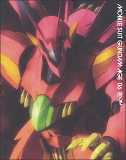 | DVD Mobile Suit Gundam AGE vol.6 BCBA-4298 / 97 minutes / 4 episodes Dolby Digital (stereo) / DVD-9 / 16:9 Anamorphic widescreen / ¥5,040 Features: 8-page AGE-FILE liner note booklet Also includes: Inner jacket illustrated by Michinori Chiba and chief mechanical animator Ken Ootsuka |