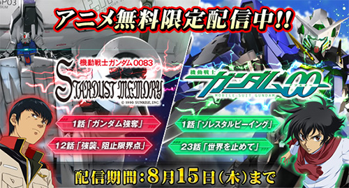 The Gundam TryAge official site adds free streaming of two episodes of both Mobile Suit Gundam 00 and Mobile Suit Gundam 0083: Stardust Memory to promote the August 8th launch of Build MS set 2!