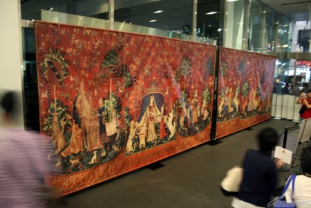 ▲「貴婦人と一角獣」をモチーフとしたタペストリーも並べて展示され、会場には荘厳な雰囲気が漂う。