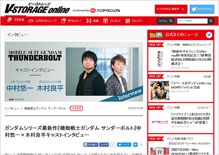バンダイビジュアルの新作や最新アイテムを紹介する「V-STORAGE online」では、地球連邦軍とジオン公国軍の両エースを演じたイオ・フレミング役の中村悠一氏と、ダリル・ローレンツ役の木村良平氏へのインタビューが掲載された。